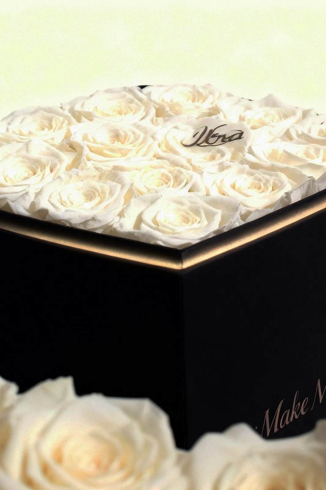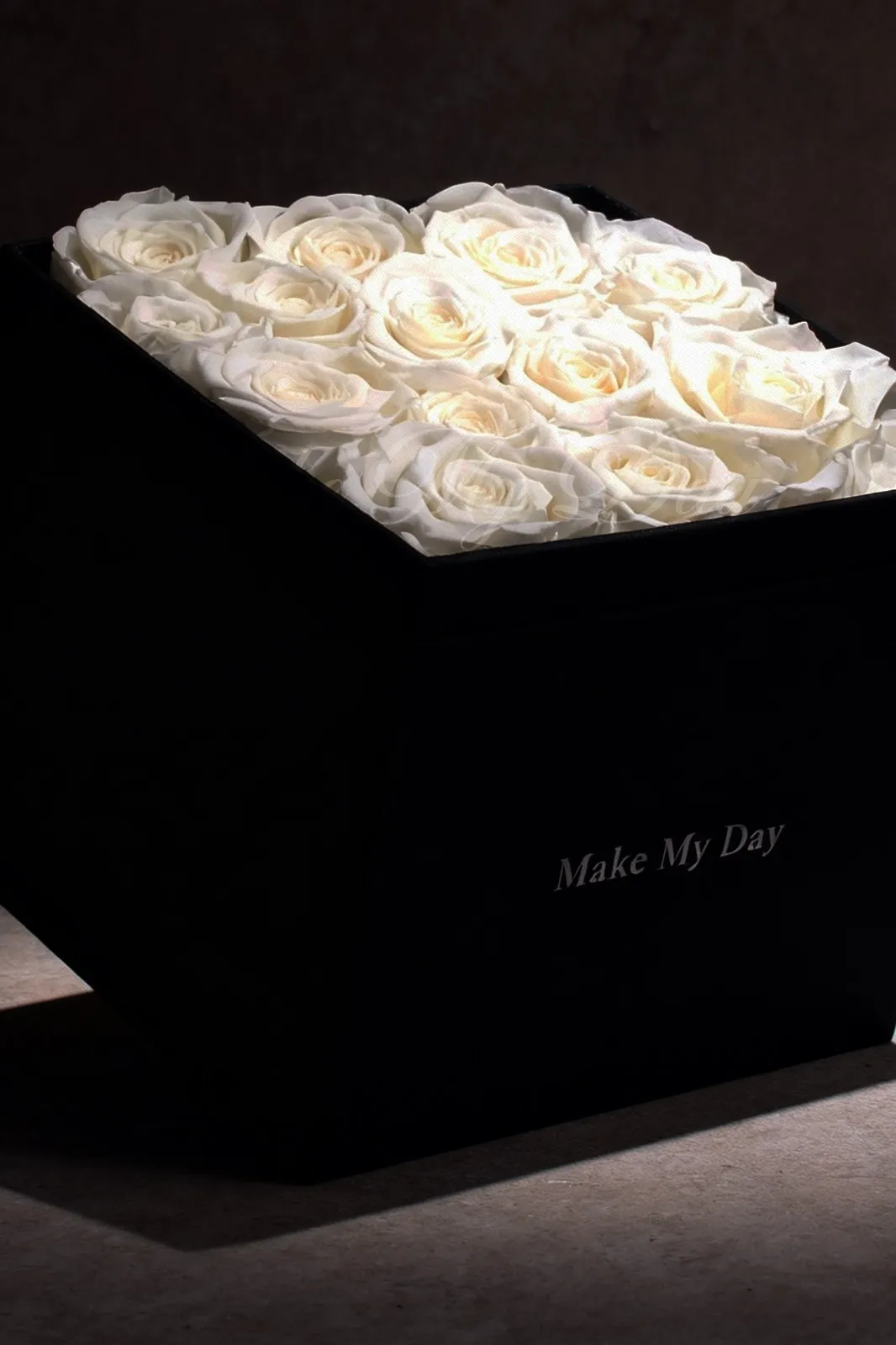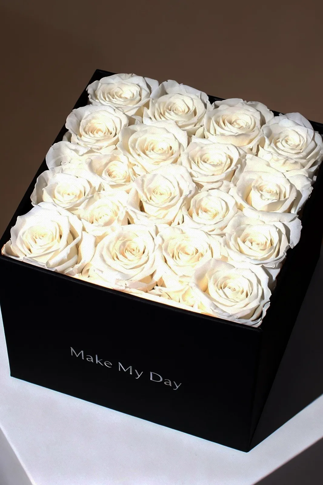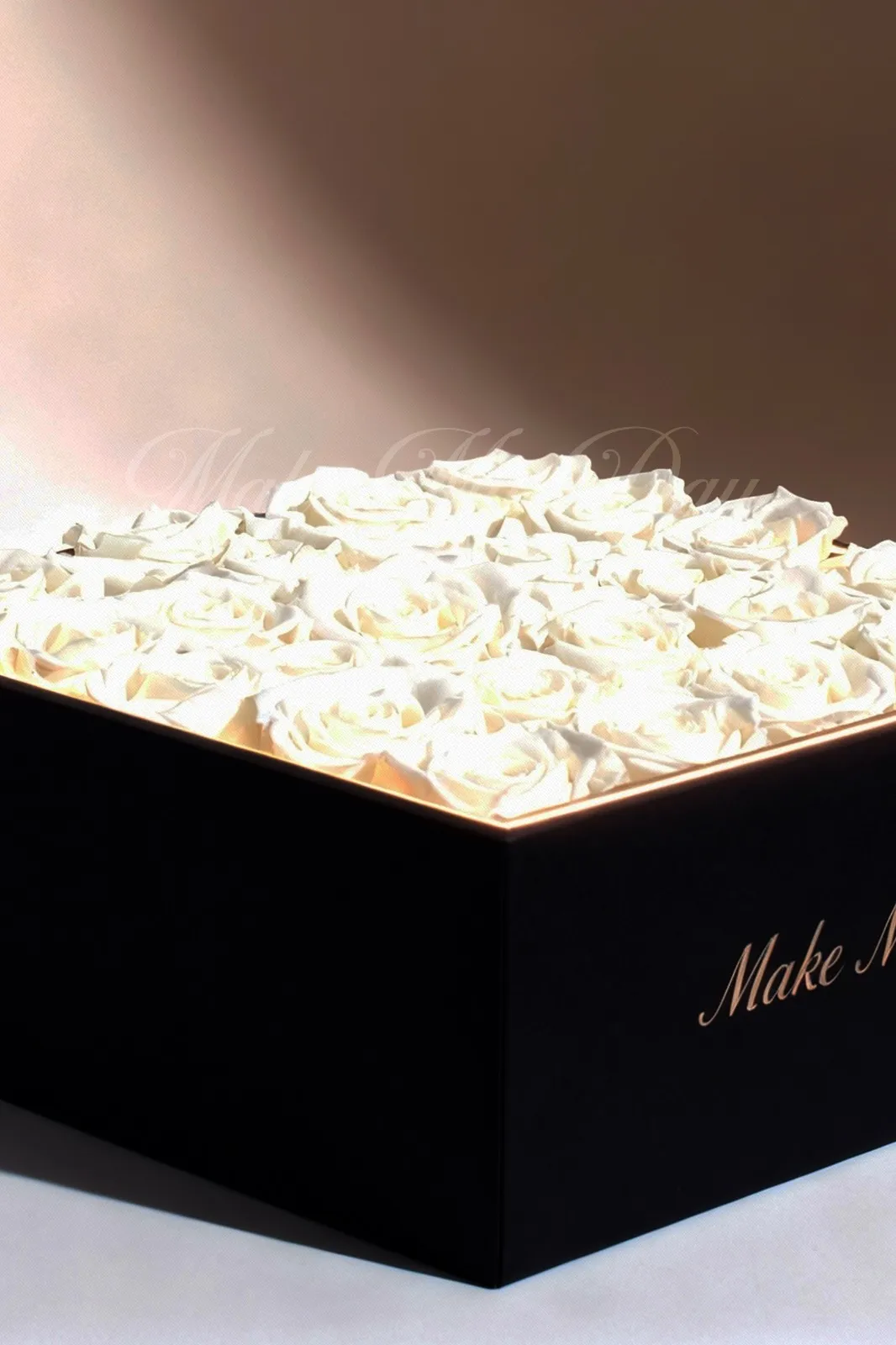White real roses square box is designed to express purity, grace, and sophistication through a premium floral arrangement. Presented in a sleek black square box, the white roses create a clean and elegant visual statement suitable for refined moments.